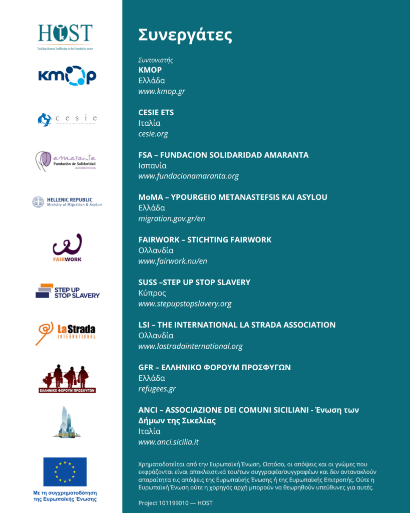 Το Ελληνικό Φόρουμ Προσφύγων (ΕΦΠ) είναι εταίρος στο HOST – Tackling Human Trafficking in the Hospitality sector, ένα έργο AMIF διάρκειας 24 μηνών με συντονιστή το KMOP. Το HOST στοχεύει στην πρόληψη και καταπολέμηση της σεξουαλικής και εργασιακής εκμετάλλευσης των μεταναστών/ριών και προσφύγων, υπηκόων τρίτων χωρών (TCNs), στον τουριστικό κλάδο, ιδιαίτερα σε περιοχές με υψηλό τουρισμό. Η διάρκεια του έργου είναι 01/06/2025 – 31/05/2027.