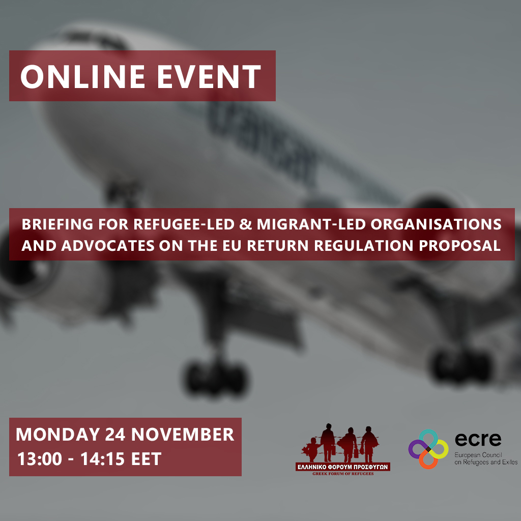 The European Council on Refugees and Exiles (ECRE) and Greek Forum of Refugees are co-organising an online briefing on the new EU Return Regulation Proposal, a legislative file that will have a direct impact on the lives and rights of people on the move across Europe.